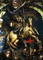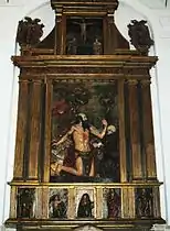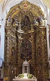 El monumental Retablo Mayor es barroco, de 1729, cuando sustituyó a otro más pequeño, de cerámica vidriada, costeado por el patrono de la Capilla Mayor. Ensamblado por Alonso de Manzano, su mazonería dorada y policromada se articula en cuatro grandes columnas salomónicas rodeadas de pámpanos y racimos de uvas. De la imaginería, tallada por Juan de Ávila, destacan el Santiago Matamoros que preside la calle central y, sobre él, en el cascarón que cierra el conjunto, la escena de la aparición de la Virgen del Pilar al apóstol y sus compañeros. Una cruz de Santiago sobre una cartela abrazada a una pulsera calada corona este ático.