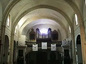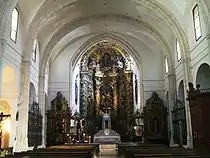 El interior presenta una sola y espaciosa nave, con cortas capillas laterales situadas entre los contrafuertes. La reforma integral ejecutada a principios del siglo XVII produjo un abovedamiento de cañón con lunetos sobre arcos fajones que apean en pilastras fasciculadas, una reminiscencia del gótico original del templo, y cuyos plementos están decorados con sencillas yeserías barrocas. La anterior cubierta era de madera y estaba sustentada por arcos diafragma. A los pies se sitúa el coro alto, alzado sobre un pequeño pórtico cubierto con un artesonado de comienzos del siglo XVI, en cuyos casetones se distinguen veneras con la cruz de la Orden de Santiago.