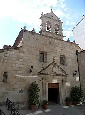 La fachada de la iglesia se encuentra retrasada en relación con la calle y en un plano inferior a esta, por lo que se salva el desnivel mediante una escalera de granito. Esta disposición y la sencillez de la fachada hacen pensar en una solución impuesta quizá por razones económicas o por las técnicas de esta diferencia de planos y que se pensara en un principio en alargarla hasta la calle, con una fachada más rica y en consonancia con la categoría arquitectónica del edificio. La escalinata habría sido interior como suceden en otros templos como los de Santo Domingo de Ribadavia o la Colegiata de Xunqueira de Ambia. Es de estilo barroco clasicista y las campanas proceden del Monasterio de Montederramo que se colocaron en 1844.