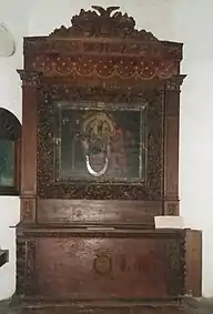 Por debajo de la hornacina central hay un pequeño sagrario que tiene en su centro una águila bicéfala tallada (signo distintivo de la heráldica de la familia de la casa de Austria), siendo un signo rememorativo a la gran dinastía de los Habsburgo que gobernó y forjó el Imperio Español, mejor conocida como Monarquía Hispánica desde el año de 1516 con el emperador Carlos I de España y V del Sacro Imperio Romano Germánico hasta la muerte sin descendencia del rey Carlos II ''El Hechizado'' en el 1700, casi 40 años antes de la construcción del templo actual.