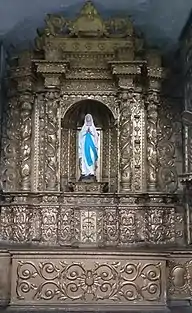 Una de las tantas joyas coloniales de gran valor artístico e histórico es este retablo que destaca por estar casi en su totalidad bañado en láminas de oro, además de contar con el característico altar para la antigua misa tridentina, sobre este cuenta con un pequeño sagrario de cara octogonal decorado con motivos vegetales y de plantas. Una doble base a cada lado de este último, son soporte de columnas geminadas o pareadas salomónicas de capitel corintio que sostienen un pequeño arquitrabe. En el centro esta un arco abocinado que sirve de hornacina para la advocación a quien se le rinde culto en este espacio y flanqueando este sitio hay 3 nichos a cada lado para el resguardo de imágenes más pequeñas (tales como ángeles o santos).