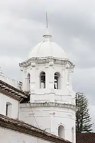 Por acción de un terremoto a fines del siglo XIX, la antigua espadaña se derrumbó por lo que se le encargó su reconstrucción al arquitecto Adolfo Dueñas[5] quien habría hecho antes la cúpula de la Catedral de la ciudad, hacia 1885, la obra quedó concluida, siendo de un diseño y estilo bastante alejado del colonial, de planta octogonal de dos niveles sustentados sobre la antigua base cuadrada y rematada con una bella cúpula aristada y pararrayos de la más pura influencia neoclásica y adaptándose bien a la fachada.