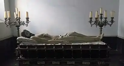 Permaneciendo así este sitio sin mayores cambios, en un tiempo no determinado, el cuadro de Santa María del Topo fue retirado de este espacio y ahora se resguarda en el Museo Arquidiocesano de Arte Religioso. Pero no fue sino hasta ya hacia la mitad del siglo XX, cuando llega a Santo Domingo la efigie de Cristo Yacente que fue tallada por el maestro José Ascencio Lamiel, inspirado por el que hizo Gregorio Fernández en 1627 y que actualmente se encuentra en el Museo Nacional de Escultura de Valladolid. La imagen de Jesús reposa hoy sobre un impresionante sarcófago aterciopelado que data del siglo XVIII y que fue traído desde Sevilla por donación de la señora Asunción de Tenorio y Arboleda, esta enchapado en carey con incrustaciones de marfil y plata española, dato curioso del ataúd es que es su interior guarda un fragmento de roca proveniente de la propia tumba de Jesús en la Basílica del Santo Sepulcro, esto fue gracias a la mediación del arzobispo Diego Maria Tamayo. En honor de esta santa imagen es que se realiza la procesión del Viernes Santo mejor conocida como la del Santo Entierro de Cristo, siendo el paso protagónico de la noche acompañado por 4 damas plañideras a cada lado.