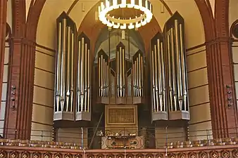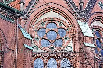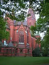 La construcción de la iglesia entre 1882 y 1885 al estilo gótico de ladrillo, con su aguja de 88 metros de altura, fue dirigida por Johannes Otzen, natural de de Holstein y responsable de la construcción de varias emblemáticas edificaciones religiosas por toda Alemania. Fue diseñada como una iglesia de salón (Hallenkirche) con una nave de 19 metros de altura y aforo para 1150 asistentes, en cuya construcción se emplearon, según se recoge en las actas, 460 tipos de diferentes piedras moldeadas y vidriadas de color rojo, amarillo y verde, lo cual planteaba ciertos desafíos logísticos y de planificación.[3] También llama la atención el uso del cobre para resaltar detalles estructurales como las torres laterales de baja altura, los pretiles de las ventanas y la torreta posicionada en la cumbrera, cuya pátina verde contrasta con la piedra roja.[4]