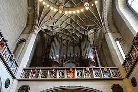 Cuando a finales del siglo XV el príncipe de Wettin Frederick III el Sabio, el elector de Sajonia desde 1486, hizo reconstruir la antigua fortaleza de Ascania, una nueva iglesia de Todos los Santos fue diseñada por el arquitecto Conrad Pflüger[4] (1450-1506 /07) y erigida entre 1490 y 1511[7] en el estilo gótico tardío.[2][5] Consagrada el 17 de enero de 1503, se convirtió en parte de la residencia de Federico o “Residenzschloss”, también llamado Schloss Wittenberg.[7][5] Amplios trabajos de Tilman Riemenschneider, Jacopo de'Barbari y Alberto Durero contribuyeron a la construcción del complejo del palacio y luego la iglesia. Después en 1502 el Elector Federico III fundó la Universidad de Wittenberg (Leucorea) y recibió la confirmación por el legado papal Raymond Peraudi en 1507, Todos los Santos fue incorporada para servir como capilla a la universidad y rápidamente se convirtió en un importante centro académico y de culto. Los estudiantes recibieron sus doctorados allí, y el reformador Philipp Melanchthon hizo su famoso discurso inaugural en la iglesia. Se desarrolló una tradición de enterrar dignatarios académicos de la universidad en la iglesia. Varios epitafios notables se conservan hasta hoy.