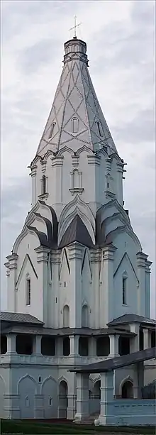 Las escaleras de madera que rodeaban la iglesia pronto fueron reemplazadas por galerías de piedra. En el siglo XVIII, se agregó una baranda de protección. El cubo central inicial se transforma en altura en una torre octogonal perforada por ventanas y coronada por una pirámide de 28 m de altura. Está adornada con rombos entrelazados en piedra blanca. El paso del cubo al octágono se realiza mediante arcos de descarga provistos de kokóshniks por encima del volumen central y sin cornisas. La planta de base es cuadrada pero las capillas laterales lo transforman en una planta cruciforme.[11] Las esquinas de las fachadas están decoradas con pilastras coronadas por capiteles en el espíritu del primer Renacimiento.