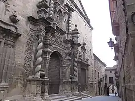 Al exterior destaca su magnífica fachada barroca de enorme plasticidad. Se trata de una portada triple rematada por un frontón triangular, en la que sobresale el tratamiento del vano central, flanqueado por enormes columnas salomónicas y coronado por una hornacina con la imagen de la Virgen.