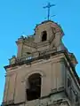 En la fachada, resaltan los altos contrafuertes que resaltan la altura de la nave, el esbelto campanario rectangular (alzado por segunda vez en el año 1913, más alto que el anterior) y la monumental cúpula alzada sobre un esbelto tambor circular con la cubierta semiesférica, revestida de cerámica multicolor (estos dos últimos elementos resultan identificativos del templo).