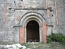 En la cara sur se sitúa la entrada al templo, en el segundo tramo del muro. Se inserta en un cuerpo que sobresale del muro, formado por un vano semicircular abocinado en profundidad y con un arco externo decorado con bolas lisas y luego otros dos arcos de arista viva que a través de una imposta moldurada apoyan en pilares adosados.