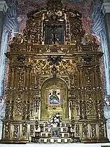 El retablo mayor es una obra barroca avanzada con influencia rococó, realizada por Pedro Bahamonde en el siglo XVIII, en madera sin dorar. En sus dos cuerpos, tres calles y el ático semicircular se disponen nueve imágenes de bulto redondo, entre ellas las de san Lorenzo -la advocación original del templo- y santos de la orden jesuita como san Ignacio de Loyola, el cual preside el ático, san Francisco Javier y san Estanislao de Kostka. La más pequeña de estas imágenes, situada en el tabernáculo desde 1768, es también la más relevante: corresponde a la Virgen de la Calle, antaño venerada en una ermita junto a la iglesia de San Bernardo, una talla de 41 centímetros fechada en el siglo XV, que por su aspecto ennegrecido recibe el nombre popular de La Morenilla. La figura aparece sostenida por cuatro ángeles del siglo XVIII. La corona que hoy ostenta esta Virgen con fama de milagrera es una obra de orfebrería castellana contemporánea, salida del taller del burgalés Maese Calvo.