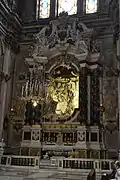 - Tercer altar: dedicado a la Virgen del Rosario con una esvultura realizada por Giovanni Battista Santacroce que proviene de la iglesia de San Vincenzo, mientras que las dos estatuas en los nichos (Santo Domingo de Guzmán y Santa Catalina de Siena) se atribuyen a la taller de Maragliano.[3]