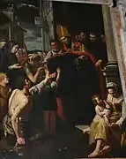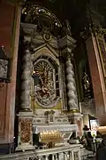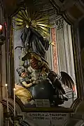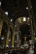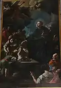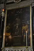 - Primer altar: dedicado a San Juan de Sahagún, con una pintura del siglo XVIII de Francesco Narice (San Giovanni da San Facondo salva miracolosamente un bambino caduto in un pozzo).