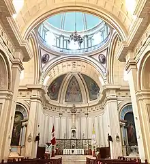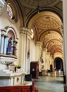En medio del crucero, se eleva la gran cúpula, con hermosos y coloridos vitrales que en su mayoría representan pasajes bíblicos, de la Vida de Jesús o de la Santísima Virgen. Una particularidad de este templo, es que sobre cada altar lateral se encuentra un vitral representando al Santo que se ubica en esa posición. También cuenta con dos portadas laterales, la del lado derecho que conduce al Convento, y la del lado izquierdo, actualmente cerrado al público pero que se abre únicamente para la entrada de los fieles durante la visita del Jueves Santo.