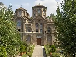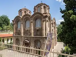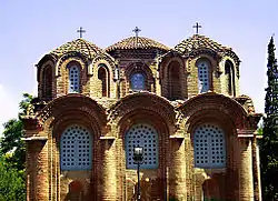 Es una iglesia que presenta la clásica y típica «planta en cruz inscrita», propia de la arquitectura del período macedonio, con cuatro columnas y tres cúpulas, una central y dos sobre el nártex. Todo el edificio está construido con ladrillos, lo que le proporcionó el apodo popular de «Iglesia roja» (Κόκκινη Εκκλησιά). El exterior está animado con una variedad de arcos y pilastras, elementos que pueden remontarse a influencia constantinopolitana. El uso de arcos con varios retranqueos da al edificio una apariencia «escultórica». Una cornisa de mármol recorre toda la iglesia, dando al edificio unas secciones diferenciadas superior e inferior. La sección inferior es más sobria, mientras que la superior se distingue decorativamente con semi-columnas entre arcos, y una trayectoria de dientes de sierra donde el muro se encuentra con el tejado.[1][3]