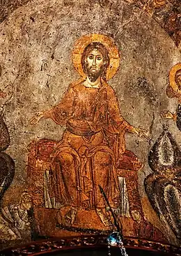 En la concha del ábside se alza la Virgen Orante flanqueada por dos arcángeles. Dos registros por debajo, en el registro inferior del santuario, hay cuatro representaciones de media longitud de «anargyroi», o «no-mercenarios»: sanadores que rechazaban pagos por sus servicios como curadores.[15] Según Gerstel, la presencia de figuras no episcopales en el bema data el programa iconográfico en «un período en el que una variedad más amplia de santos podían colocarse en el santuario».[16]