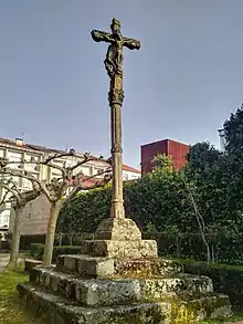 El atrio da acceso al recinto de la iglesia, donde se levanta sobre una antigua necrópolis romana[1] un crucero plateresco anteriormente emplazado en la Horta do Concello (actual Alameda do Concello). Compuesto por imágenes de Cristo, la Piedad y cuatro medallones en representación de los cuatro evangelistas, este crucero es obra de Jácome de Moure, padre del célebre escultor orensano Francisco de Moure.[3]