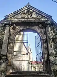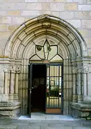 La puerta del atrio exterior perteneció al Hospital de San Roque, fundado en el siglo xvi por el obispo Francisco Blanco, y fue trasladada a su emplazamiento actual desde su ubicación original en la Alameda do Concello, lugar que hoy ocupa el edificio de Correos. Obra renacentista del siglo xvi, consiste en un arco de medio punto enmarcado por dos columnas acanaladas y con dos medallones representando a los médicos Hipócrates y Galeno. Posee tímpano triangular con una hornacina presidida por una imagen pétrea de San Roque, mientras en los extremos dos figuras fantásticas en representación del mal completan el conjunto, coronado en el vértice por un ángel, hallándose en la parte posterior de la puerta una pequeña escultura de la Piedad.