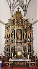 En el interior, de planta basilical, destaca la capilla mayor, cubierta con bóveda de crucería con profusión de nervios y claves y presidida por un retablo plateresco del siglo xvi obra de Cornielles de Holanda, autor del retablo mayor de la Catedral de Orense. De policromía verde oscura con motivos en dorado, cuenta con cinco cuerpos, cinco calles y un ático, en el cual destacan un Cristo crucificado con Dios Padre al fondo y, en el techo, el Espíritu Santo en forma de paloma. El retablo, presidido por una escultura de gran tamaño del Sagrado Corazón de Jesús, alberga numerosas tallas, entre ellas imágenes de Santa Rita de Casia, Santa Teresa de Lisieux, San Benito de Nursia, San Blas de Sebaste, San Roque y la Virgen del Perpetuo Socorro. A ambos lados se hallan dos retablos de estilo barroco e idéntica policromía, aunque a diferencia del retablo mayor, estos cuentan con una única hornacina enmarcada por columnas salomónicas ornamentadas con motivos vegetales, estando el de la izquierda presidido por una imagen de la Inmaculada Concepción y el de la derecha por una talla de San José.