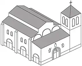 ![]() Recreación hipotética de la iglesia para el siglo XVIII, según dibujo de J.A. Fernández | ||