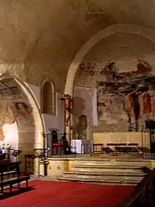 - una capilla de planta rectangular, y cubierta por bóveda de crucería, paralela a la extensión de la nave central cubierta por la bóveda de cañón (cuenta con pinturas al fresco probablemente de principios del s. XVI: Martirio de Santa Catalina, Virgen galactotrofusa, Martirio de San Sebastián);
