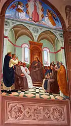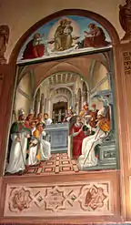- la bendición del legado papal a Juan de Austria en una escena de la batalla de Lepanto, cuyo resultado fue adjudicado por el cristianismo a la intercesión de María, auxilio de los cristianos (auxilium christianorum).