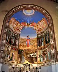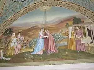 Esta planta superior es de una sola nave y tiene carácter festivo. La planta alta está dedicada a la glorificación de María, madre de Jesús en la historia del cristianismo. En el ábside se representa a la madre de Jesús rodeada de santos en el cielo y de los fieles en la tierra.