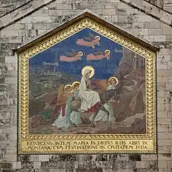 Una gran puerta sustituye a la apertura original del siglo XII. Es una hermosa obra de hierro forjado, coronada en medio por dos estatuillas que representan a Isabel y Zacarías. La fachada de la Iglesia de la Visitación está decorada con un valioso mosaico que muestra a María, madre de Jesús acompañada por ángeles en su camino de Nazaret a Ein Karem, para visitar a su pariente Isabel, esposa de Zacarías, sacerdote del templo. En el mosaico, además de María en primer plano, se pueden observar los letreros que marcan el lugar de salida (Nazaret) y de destino (Ein Karem), donde la aguarda Isabel. Al pie, en el marco dorado, se lee el texto en latín de un versículo del Evangelio de Lucas:[2]