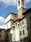 La ágil y armoniosa fachada [4] de tres órdenes destaca por su acentuado verticalismo. A salvo de las supresiones napoleónicas, conserva en gran parte su mobiliario original de pinturas y esculturas. Entre estos se encuentran: "la Virgen con varios santos, de Cavalier Vanni ; el milagro de San Teodoro de Pietro Testa ; la mesa antigua que representa, arriba, la coronación de la Virgen con varios santos, abajo, en el frente arrodillado, un papa y un guerrero con la torre de Lucca en el medio, probablemente atribuida a Giotto; mesa "de la que habla Vasari en su vida, aunque la descripción no corresponde" [5] [6] .