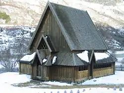 Se nombra por primera vez en una fuente escrita de 1347, pero es datada en ca. 1200. Se situaba en un principio en un solar justo al lado del fiordo. En 1747 fue derribada, al iniciarse la construcción de una moderna iglesia de piedra en el pueblo. Los restos de la stavkirke fueron escondidos, y su paradero se ignoró hasta 1935, cuando durante las obras de expansión de la nueva iglesia, se hallaron bajo su suelo piezas de madera de la stavkirke.