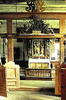 Además de los postes esquineros (stav), hay postes en medio de los muros y uno más en medio de la nave. En los costados norte y sur la iglesia tiene puntales que proporcionan soporte adicional a los muros, característica esta última sólo compartida con la iglesia de madera de Rødven.