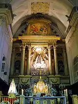 En cuanto a mobiliario, la iglesia albergó un rico patrimonio artístico, diezmado con el paso del tiempo. El presbiterio está presidido por un gran retablo de líneas clasicistas, que sustituye al que en su día trazó Sebastián de Benavente para dicho espacio. En el ático, una Trinidad, obra del pintor Antonio de Pereda, autor también de otros dos cuadros situados en el crucero, representando respectivamente el Castigo de san Eliseo y la Destrucción de los falsos profetas por san Elías, dos de sus obras más destacadas.[5] Preside el retablo una imagen de la Virgen del Carmen, obra de Juan Sánchez Barba, única escultura superviviente de un grupo representando la Entrega del santo escapulario a san Simón Stock.
