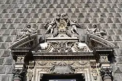 También el portal de mármol es del Palazzo Sanseverino y data de principios del siglo XVI. Sin embargo, en 1695 los jesuitas realizaron algunas modificaciones en los finos bajorrelieves, en las ménsulas sobre las que se apoya el friso superior y en la cornisa: prolongando la cornisa del portal, añadieron a los lados dos columnas corintias de granito rojo, un frontón quebrado coronado por el escudo de la Compañía de Jesús (con dos querubines en el acto de sostener el escudo) y otros dos ángeles más grandes, uno a cada lado del frontón. Los ángeles y el frontón fueron realizados por Pietro y Bartolomeo Ghetti. El emblema de los jesuitas, colocado en el interior de un escudo oval, consiste en la cruz con el famoso monograma IHS del nombre de Jesús[9] y, debajo de él, los tres clavos de la crucifixión de Cristo. Sobre las dos jambas del portal, al lado de los capiteles de las dos columnas, se colocaron los escudos de los Sanseverino y los Della Rovere que, en dimensiones mayores, están reproducidos también en la parte más alta del margen extremo derecho e izquierdo de la fachada, en las partes sin almohadillado, mientras que sobre el arquitrabe se añadió otro friso con cinco cabezas que sostienen cuatro guirnaldas de fruta. Desde cada cabeza se bifurcan cintas que forman curvas y volutas, mientras que las cuatro guirnaldas están coronadas por otros tantos emblemas, correspondientes también a los escudos de los Della Rovere y de los Sanseverino (en versión reducida), alternados por dos coronas (la cabeza central, desafortunadamente, se ha perdido completamente).