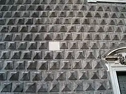 La fachada del Palazzo Sanseverino se convirtió en la fachada de la iglesia; esta se caracteriza por su particular almohadillado, compuesto por una especie de pequeñas pirámides que sobresalen hacia el exterior, utilizadas habitualmente en el renacimiento véneto. Estas pirámides presentan extrañas marcas grabadas por los cortadores de piedra napolitanos que dieron forma a la durísima piedra de piperno. La interpretación tradicional era que estas marcas caracterizaban a los diferentes equipos de trabajo en los que se dividían.[8]
