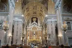 El interior, rico en decoraciones de mármol realizadas por Fanzago en 1630, es a cruz griega con el brazo longitudinal ligeramente alargado. Presenta una cúpula en correspondencia con el centro del transepto y diez capillas laterales, cinco por lado, de las cuales dos están colocadas al lado del ábside, a lo largo de la pared presbiterial.[5]