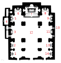 En la nave izquierda se abren en total cinco capillas: tres grandes capillas están a lo largo de la nave, una aún más grande corresponde a la parte terminal del transepto (después de la segunda capilla) y una última actúa como «ábside de la nave».