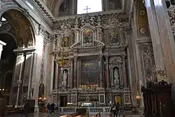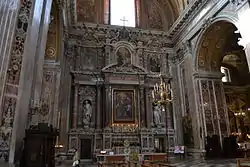 La tribuna está decorada con frescos de Massimo Stanzione, mientras que, realizada a caballo entre los siglos XVII y XVIII por Cosimo Fanzago, en la pared principal hay una estructura de mármoles policromos con seis columnas de alabastro en cuyo centro hay una hornacina que alberga la Virgen de 1859 de Antonio Busciolano con dos altorrelieves en los lados de la escuela de Domenico Antonio Vaccaro que representan a San Ignacio de Loyola y a San Francisco Javier, y debajo de ellos dos esculturas Busciolano que representan a San Pedro y a San Pablo.[12] El grupo de ángeles que sostiene el globo sobre el que está colocada la Virgen data del siglo XVIII y es obra de artistas desconocidos. Finalmente, el altar mayor es una obra de mediados del siglo XIX proyectada por el jesuita Ercole Giuseppe Grossi y ejecutada por Raffaele Postiglione.[12]