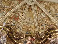 Encima de cada una de estas dos puertas sobresalen dos balcones con la misma factura y proporciones que las que se encuentran encima de los arcos de las capillas. Sobre estos balcones hay una gran cornisa de la que arrancan los arcos centrales, de estilo ojival, que sostienen la cubierta uniéndose en cuatro grandes claves de bóveda.
