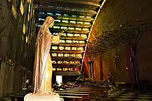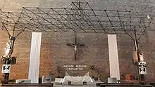 El interior contiene piezas de escultura religiosa moderna y vitrales.