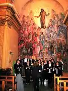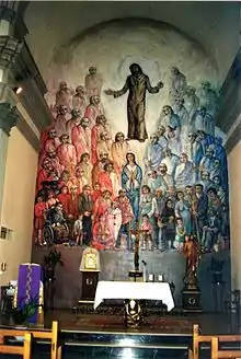 - Vista frontal del antiguo retablo de pincel, obra de Salomón (1976) en la parroquial de Casas Bajas (Valencia), con detalle del Coro Interparroquial.