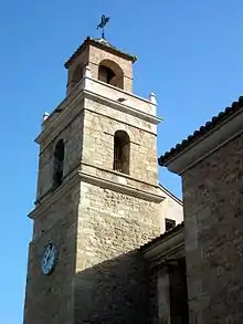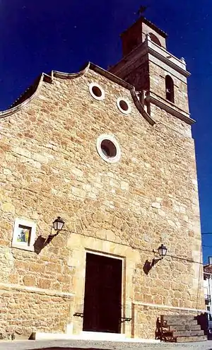 ![]() Vista frontal (oriental) de la parroquial de Casas Bajas (Valencia), con detalle de la entrada y torre-campanario a los pies, lado de la epístola. | ||