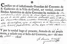 «Certifico yo el infrafirmado Guardián del Convento de S. Guillermo de la Villa de Castiel, ser verdad, como el Síndico Apostólico de dicho Convento ha recibido de Manuel Antón y Rubio vecino de Casas Bajas del Río, depositario por los vecinos de las limosnas destinadas para el Retablo Cincuenta libras, moneda corriente, primera paga de los doscientos pesos a que se obligaron en la trasacción de dicho Retablo, perteneciente dicha paga al año 1825.».[1]Del paisaje, alma del Rincón de Ademuz, Alfredo Sánchez Garzón