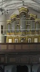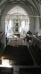 La edificación, construida con piedra de cantera, es una iglesia de salón reforzada por 22 contrafuertes, con una nave amplia y un coro cerrado en tres lados. Se construyó una planta defensiva de ladrillos sobre el coro, y hay otras dos sobre el techo abovedado de la sacristía. Se accede a estas plantas a través de dos pequeñas torres de ladrillo en la parte oeste de la iglesia.[1] La parte defensiva es ligeramente más ancha que la sala inferior. El techo de la nave, también abovedado, fue reconstruido en 1878. La decoración interior es principalmente barroca, y solo el púlpito del coro, ricamente decorado, es gótico. En las paredes exteriores se conservan fragmentos de inscripciones.[2] En la iglesia destacan los dos portales en arco en los lados norte y sur, las ventanas superiores con sus delicados detalles góticos, el altar barroco y sus decoraciones florales en madera tallada, así como el órgano de 1786.[4]