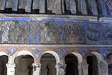 - La iglesia vieja data del siglo X. Originalmente era una iglesia de nave simple con bóveda de cañón. Pero su ábside fue destruido cuando se añadió la iglesia nueva a finales del siglo X o principios del XI. Ahora la iglesia vieja facilita la entrada a la nueva. La iglesia vieja está decorada con tonos pálidos de rojo y verde pintados en tiras para representar escenas del Nuevo testamento y descripciones de santos. El trabajo más elaborado de la Iglesia vieja es el ciclo cristológico localizado en la bóveda de cañón de una nave lateral de la basílica. En cada lado de la bóveda hay 32 escenas describiendo narraciones sobre la tradicional triple división de la vida de Cristo: la infancia, los milagros y la pasión.[2]