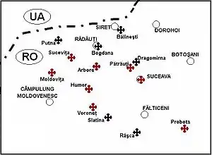 Mapa con la situación de los más importantes monasterios moldavos.