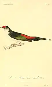 ![]() Ejemplar macho de saltarín militar (Ilicura militaris) en São Luiz do Paraitinga, estado de São Paulo, Brasil. | ||