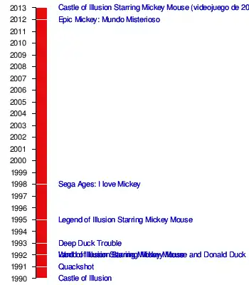 Primer videojuego | Castle of Illusion Starring Mickey Mouse (20 de noviembre de 1990) | |