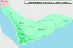 Al-Mu'ayyad Muhammad murió en 1644. Le sucedió Al-Mutawakkil Isma'il , otro hijo de al-Mansur al-Qasim , que conquistó Yemen en su totalidad, desde Asir en el norte hasta Dhofar en el este.[12][13][14][15]