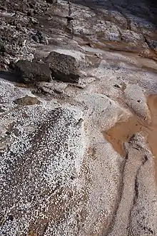 El drenaje ácido es una de las problemáticas ambientales más relevantes que enfrenta la industria minera.[30] Si bien se produce de forma natural en algunos entornos como parte del proceso de meteorización de las rocas, se ve agravado por las perturbaciones de la tierra a gran escala, como aquellas características de la minería, por lo general dentro de rocas que contienen una gran cantidad de minerales sulfurados. Cuando el proceso de extracción expone los sulfuros al agua y al aire, juntos reaccionan para formar ácido sulfúrico. Este puede disolver otros metales y metaloides nocivos (como el arsénico) de la roca circundante. El drenaje ácido se puede liberar en cualquier lugar de la mina donde los sulfuros estén expuestos al aire y al agua, incluidos las pilas de roca estéril, relaves, tajos abiertos, túneles subterráneos y plataformas de lixiviación. El drenaje ácido de la mina es especialmente dañino porque puede ocurrir indefinidamente, mucho después de que la actividad minera ha terminado.[31]