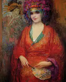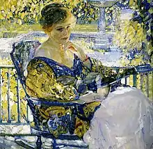 Frederick Frieseke era un artista nacido en Míchigan y formado en Chicago que había estudiado en París. Se instaló en Giverny en 1906, donde pintó figuras femeninas en escenarios al aire libre, utilizando una paleta de colores pastel. Muy influenciado por Renoir, los lienzos de Frieseke estaban cuidadosamente diseñados y, a menudo, yuxtaponía un patrón con otro.