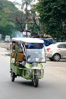 Se aprobó una Ley de Vehículos a Motor (Enmienda) por el Parlamento en 2015, que estableció los e-rickshaws operados por batería como forma válida de transporte comercial en India.[40] Con su medida pequeña y radio de torneado pequeño, el E-rickshaw es ya un modo popular de transporte en Delhi-NCR, particularmente en caminos pequeños y áreas congestionadas.